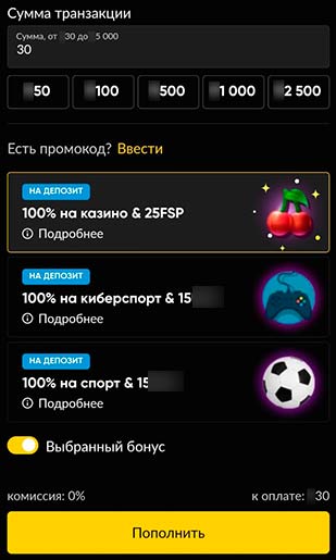 В большинстве случаев для игроков из стран СНГ букмекерская контора предлагает оплату с помощью банковских карт, онлайн-кошельков и сервисов, а также криптовалют. После выбора способа депозита на экране появится новое окно, в котором требуется вписать сумму и указать желаемый бонус (от него можно отказаться). Далее необходимо нажать на «Пополнить».