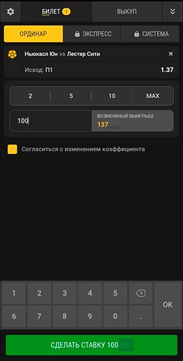 Если отключить функцию «Согласиться с изменением коэффициента», прогноз не будет принят букмекером при изменении котировки события после его добавления в купон. Эту опцию эксперты рекомендуют активировать при оформлении пари в лайве.