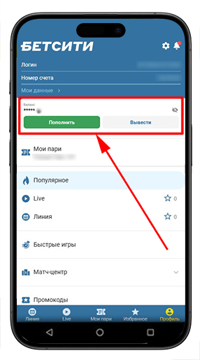 При пройденной идентификации кнопки для операций с балансом можно найти во вкладке «Профиль». Информация о состоянии игрового счета будет отображена в верхней части экрана.