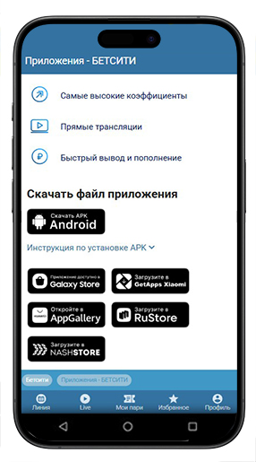 Установить приложение на смартфон можно напрямую с сайта букмекерской конторы или через известные маркетплейсы — App Store, AppGallery, Galaxy Store, RuStore, NashStore и GetApps. В статье — инструкции, как скачать Бетсити на Андроид бесплатно для ставок на спорт и забрать бонус до 3000 RUB после заключения первого пари. Рассмотрены особенности программы, описаны ее сильные и слабые стороны. Также статья дополнена разбором часто задаваемых вопросов, возникающих у клиентов при использовании софта.