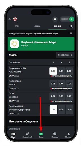 Чтобы поставить экспресс, в линии выбираются несколько исходов из разных событий. Все они будут добавляться в купон. В строке меню отобразится количество выбранных исходов.
