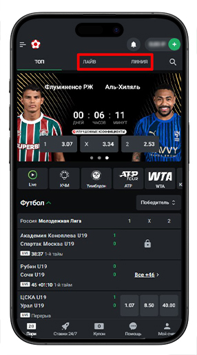 При входе в приложение на главной странице отображаются топовые события из лайва и линии прематч. По этим разделам предусмотрен поиск по названию команды или турнира.