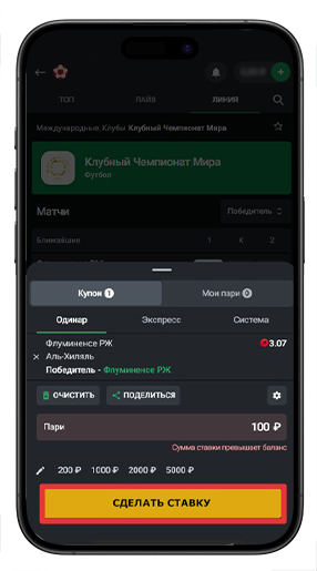 Выбрав спортивное событие и пари, необходимо нажать на коэффициент. Далее откроется купон. В нем нужно указать сумму пари и подтвердить нажатием кнопки «Сделать ставку».