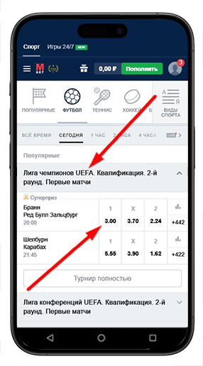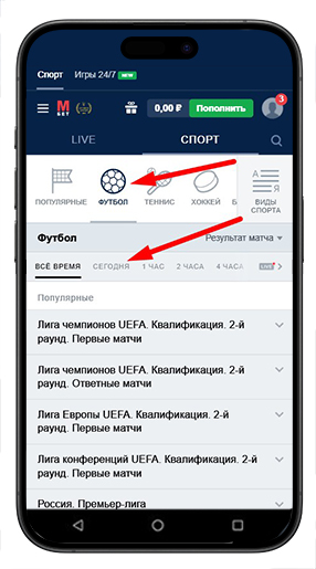 - Перейти в линию «Спорт», выбрать дисциплину и открыть вкладку «Сегодня».