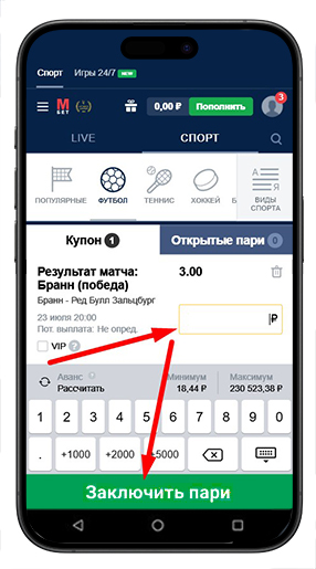 - Указать сумму и нажать на кнопку «Заключить пари».