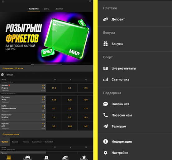 После запуска ПО перед беттором открываются информационный баннер и live-линия. Прокрутив страницу вниз, пользователь может посмотреть список популярных матчей, которые еще не стартовали. В нижней части экрана расположена панель с меню, содержащим кнопки перехода к линии киберспорта, купону ставок, вкладке с платежами и окну фаворитов. Вверху слева находится иконка в виде трех горизонтальных полос, нажатие на которую выведет список основных категорий БК.