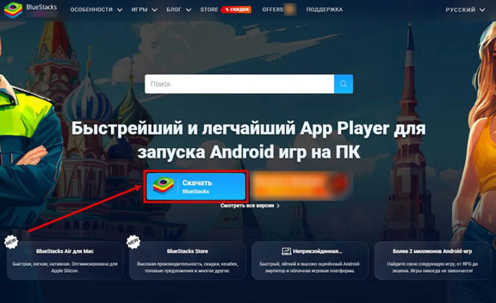 В качестве примера редакция использовала программу BlueStacks. Чтобы установить ее на компьютер, необходимо перейти на официальный сайт эмулятора и нажать на кнопку «Скачать».