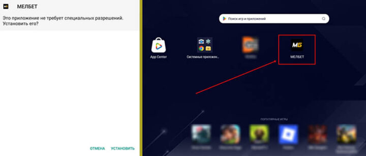 После загрузки APK-файл автоматически определяется программой BlueStacks. Утилита запускает установку приложения Мелбет, предварительно требуя подтверждение от пользователя. После завершения этой процедуры на рабочем экране BlueStacks появится иконка БК Melbet. При нажатии на нее будет открываться приложение, как на устройстве с системой Android.