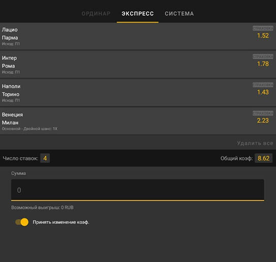 Завершающий шаг — указание суммы сделки и ее подтверждение. По умолчанию включена опция принятия пари даже в случае движения коэффициентов. Если убрать ползунок с этой функции, беттору нужно будет каждый раз при изменении котировок дополнительно подтверждать прогноз.