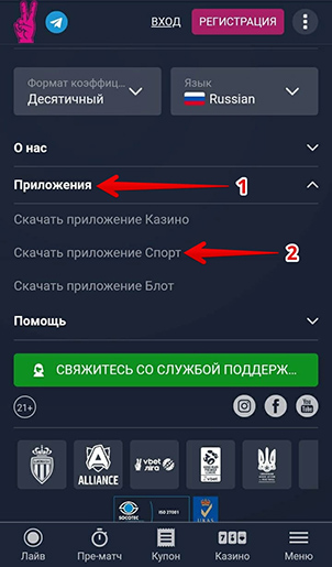 Наиболее безопасный вариант — скачать мобильное приложение букмекерской конторы Виваробет на android с официального сайта. Для этого нужно войти с мобильного на любую страницу БК, пролистать вниз, развернуть вкладку «Приложения» и среди появившихся вариантов выбрать «Спорт».
