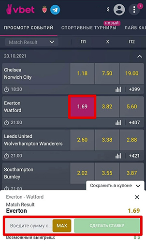 После того как выбрано подходящее пари, следует нажать на соответствующий ему коэффициент — отобразится купон, где нужно ввести сумму и нажать кнопку «Сделать ставку».