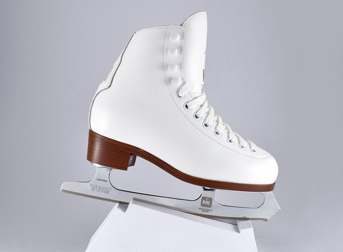 Главный элемент — фигурные коньки. Они должны быть подобраны по размеру, хорошо фиксировать голеностоп и не вызывать боли или давления. Для начинающих подойдут профессиональные модели начального уровня. Базовые коньки слишком мягкие. Нога в них «заваливается», что мешает обучению и может привести к травме связок.