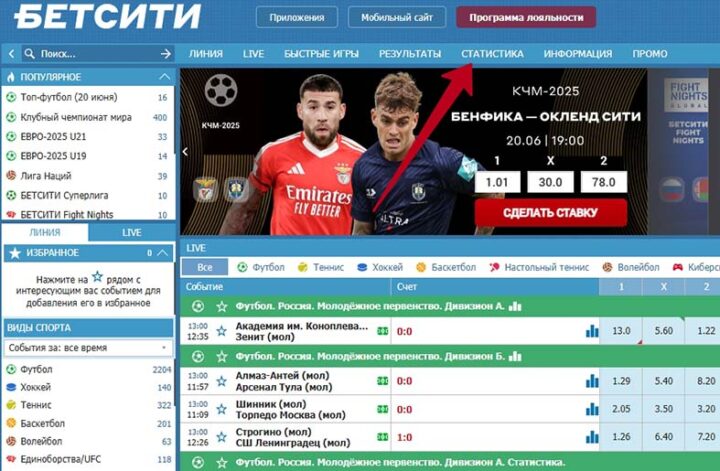 Раздел «Статистика» расположен в верхнем меню официального сайта БК. При использовании мобильной версии он отображается на левой боковой панели (вкладка «Матч-центр»).