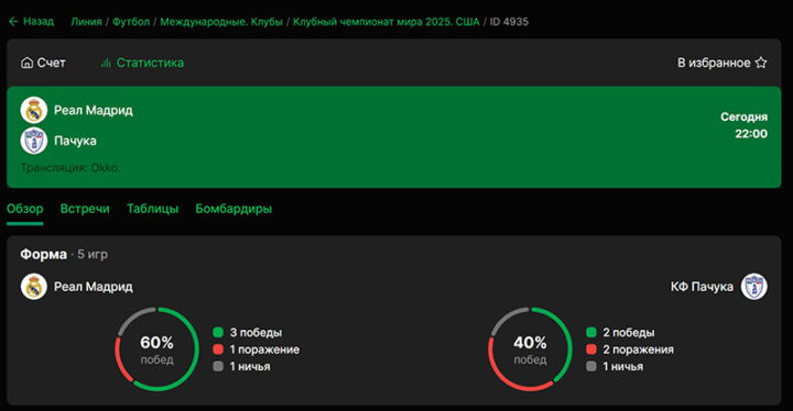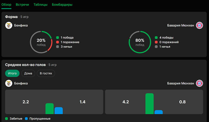 Для примера рассмотрен поединок Клубного чемпионата мира 2025 года между «Бенфикой» и «Баварией». В последних 5 матчах немцы победили 4 раза и единожды сыграли вничью. В среднем они забивают 4.2 гола, а пропускают 0.8 мяча за встречу. У их оппонентов из Португалии 1 победа, 3 ничьих и 1 поражение. В среднем «орлы» забивают за игру 2.2 гола, а пропускают 1.4 мяча.