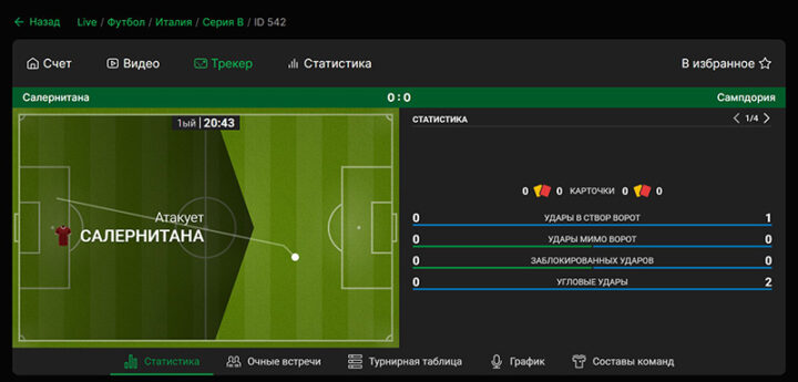 Также букмекер ведет текстовую трансляцию всех значимых игровых событий в противостоянии. В отдельной вкладке пользователям доступны изучение расстановки спортсменов на поле (площадке), получение информации о заработанных ими карточках и совершенных голевых действиях.