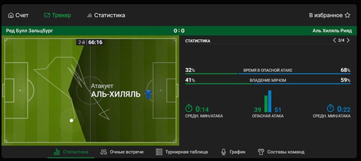 Другой пример — анализ матча в лайве. Поединок Клубного чемпионата мира по футболу 2025 года между командами «Ред Булл Зальцбург» и «Аль-Хиляль» Эр-Рияд, на табло 63-я минута. Саудиты считаются фаворитами встречи, но пока что не смогли открыть счет в матче. Букмекер показывает, что номинальные гости проводят 68% времени в опасных атаках и подали уже 8 угловых. При таком натиске вполне ожидаемо, что до конца матча они забьют хотя бы один гол. Можно оформить пари на ИТБ2(0.5) с коэффициентом 1.85.