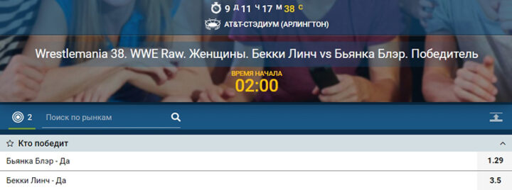 - Появится на ринге. В любой момент в противостояние рестлеров может вмешаться другой боец. Букмекерская контора предлагает попробовать предугадать, случится это или нет в указанном матче. Участие в самом бою необязательно, ставка рассчитывается только по факту появления.