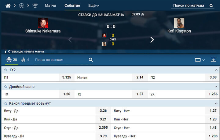 - Возьмут предмет — да/нет. Для ударов виртуальные рестлеры могут использовать кий, стул, кувалду, стол или лестницу. Поставить можно и на это явление.
