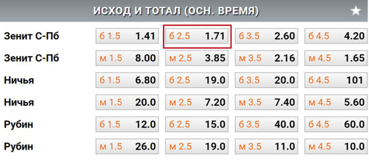 Такие исходы есть в большинстве букмекерских контор. Чтобы ставка зашла, необходима победа (или не поражение) команды и соответствие выбранному количеству голов. Плюс таких ставок — на них коэффициенты выше, чем на тотал. Однако они имеют повышенную маржу. Рассмотрим пример.