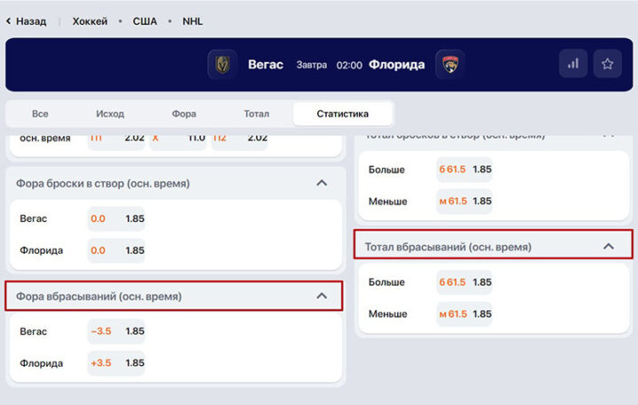 При заключении пари на тотал беттору предстоит решить, сколько раз шайба будет введена в игру. Например, в дополнительной росписи на матч НХЛ «Вегас» — «Флорида» ставка на ТБ(61.5) пройдет, если будет проведено минимум 62 вбрасывания. Для получения дохода с маркета ТМ(61.5) в основное время поединка должен произойти 61 розыгрыш или меньше.
