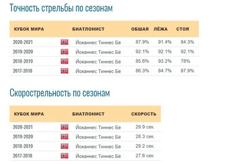 Статистика скорострельности и точности стрельбы по сезонам на примере биатлониста Йоханнеса Тиннеса Бё