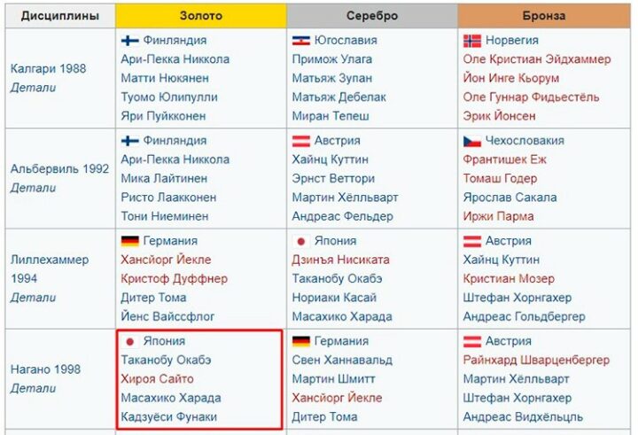 Примером яркой победы на домашних соревнованиях в данной дисциплине является успех спортсменов из Японии на Олимпиаде, проходившей в Нагано в 1998 году. До этого японцы первых мест в этом виде спорта не занимали.