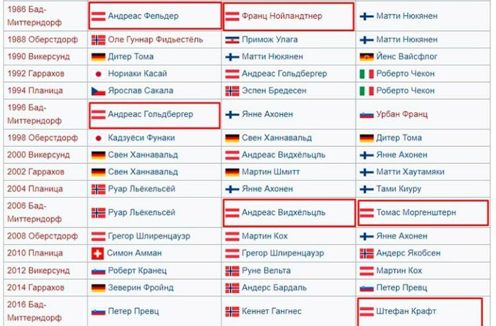 Также много призовых мест завоевывали австрийцы, когда чемпионаты мира проходили в городе Бад-Миттерндорф. На родном трамплине Кулм они редко кому уступают. Хотя и на других площадках спортсмены из Австрии выступают вполне успешно.