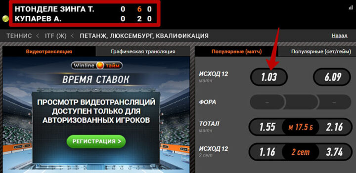 Пример из тенниса, почему поставить по ходу поединка можно по самым низким котировкам. Играют явный фаворит, №1 в росписи, и аутсайдер — №2. БК предлагали заключать пари в прематче на П1 с кэфом больше 1.2. Букмекеры допускали, что андердог выдаст очень упорный матч, а фаворит мог недооценить соперника.