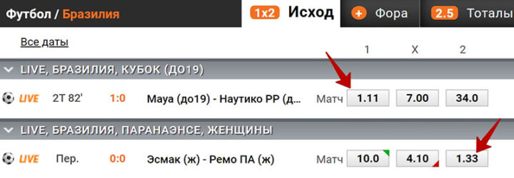 Представим игровой день в футболе из двух матчей. В каждом есть явные фавориты в лайве. Значения на их победу: