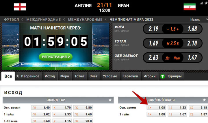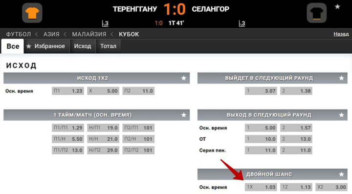 Двойной исход на футбол — один из самых «безопасных» прогнозов в линии прематча. Для его прохода должно сыграть одно из двух событий: П1 или Х, П1 или П2, Х или П2. Шансы фаворита на победу или ничью во встрече с явным аутсайдером велики, поэтому котировка у такого исхода низкая.