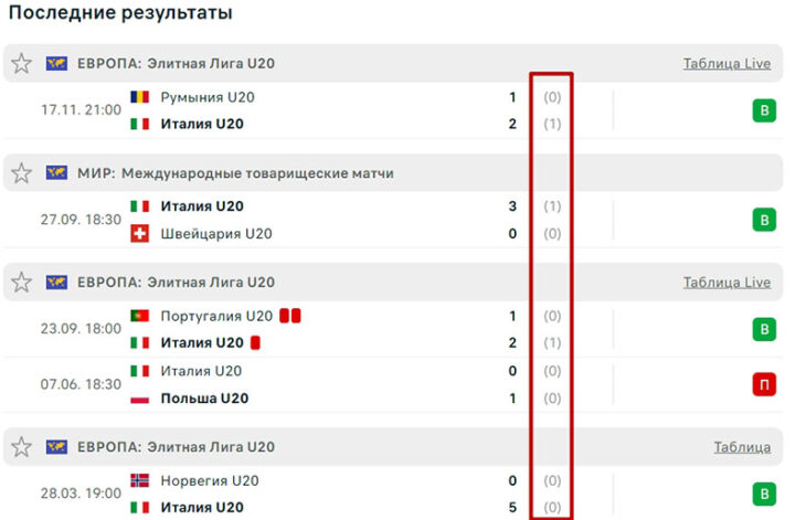 Пример. Италия выиграла 4 из 5 последних поединков, не пропустив в первых таймах.