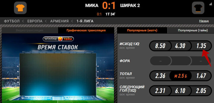 Пример из футбола. Беттор видит значение 1.35 на П2. На первый взгляд, это скромный показатель, который подходит для игры по стратегии низких котировок.