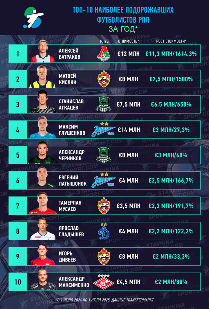 Топ-10 наиболее подорожавших футболистов РПЛ (2024-2025)