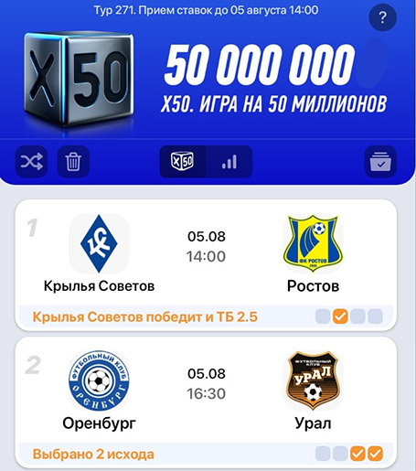 Для получения выигрыша клиенту нужно угадать исходы всех 13 матчей. Если в тираже будет несколько победителей, то 50 млн рублей поделят между ними поровну.