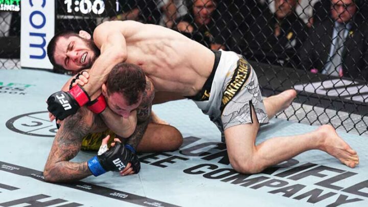 Фото: UFC/Getty Images 18 января 2025 года, Лос-Анджелес. Ислам Махачев побеждает Ренато Мойкано и защищает титул чемпиона UFC.