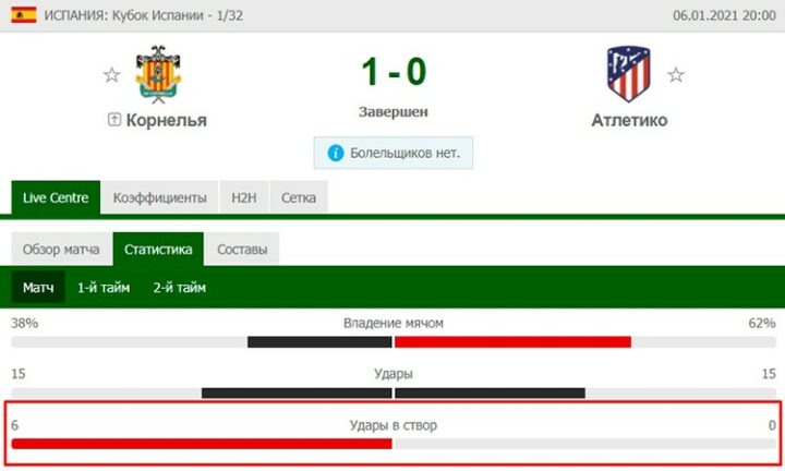 - Важность поединка. В матчах чемпионата против слабых соперников, а также в национальном кубке, наставники могут предоставить отдых ключевым футболистам. В результате снизится количество атак, а значит и попаданий в площадь ворот. Если резервистам не удастся добиться поставленной задачи, основа выйдет на замену. Например, вылет «Атлетико» из Кубка Испании на стадии 1/32. Мадридцы вышли резервным составом и, не ударив ни разу в площадь ворот, покинули турнир.