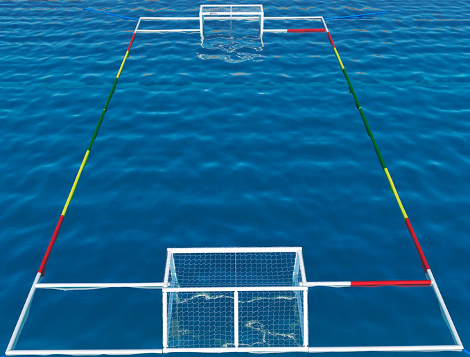 Конструкция обязательно оснащается сеткой, располагается на линии воды, может быть плавающей или жестко закрепленной. По правилам она должна быть устойчивой, но при этом безопасной при игровом контакте.