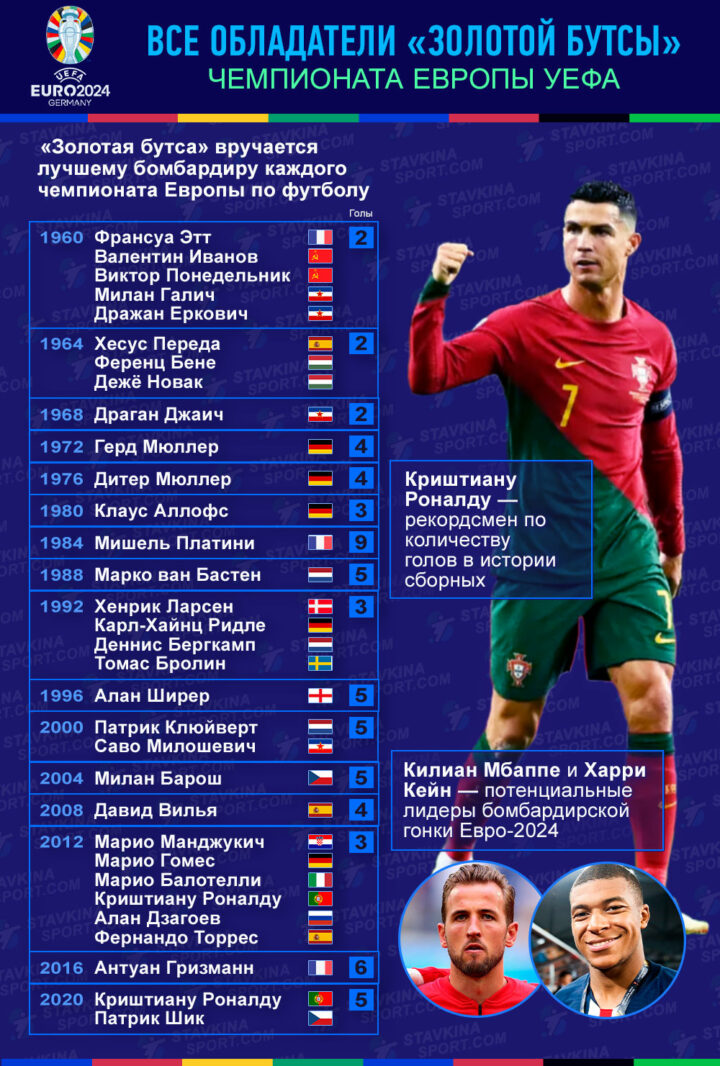 Команда vsestavkinasport.com подготовила подробную инфографику о всех обладателях «Золотой бутсы» чемпионатов Европы по футболу. Кстати, эксперты сайта будут готовить аналитические прогнозы на матчи Евро-2024.