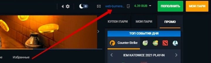 - Авторизовавшись на сайте букмекера, кликнуть по email в верхнем меню.