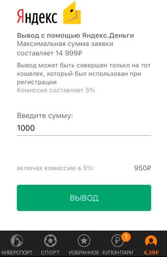 - После выбора способа оплаты потребуется указать сумму и нажать зеленую кнопку «Вывод». Также на этой странице отображается размер комиссии.