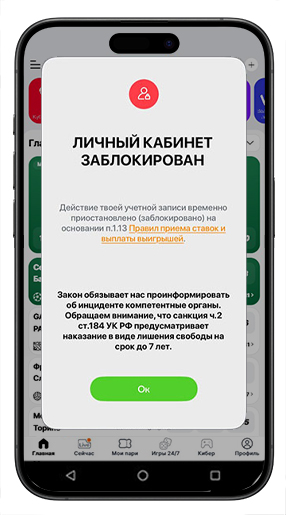 Возможна блокировка клиента в случае выявления, что пользователь сделал ставку на событие, в котором принимал участие. Также букмекерская контора закрывает счет беттора при подозрении во взломе профиля.