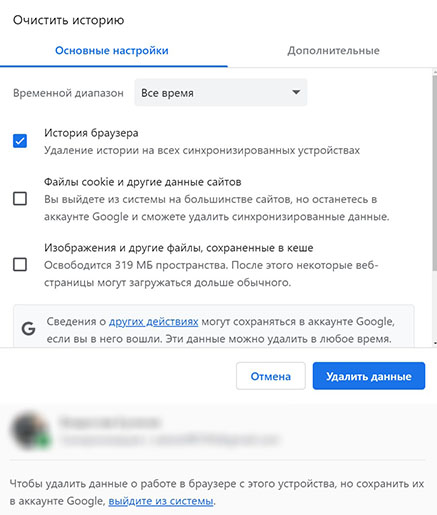 По умолчанию браузер очищает информацию за все время. Изменить этот параметр можно в верхней части всплывающего окна. Дополнительные варианты: последний час, сутки, неделя или месяц.